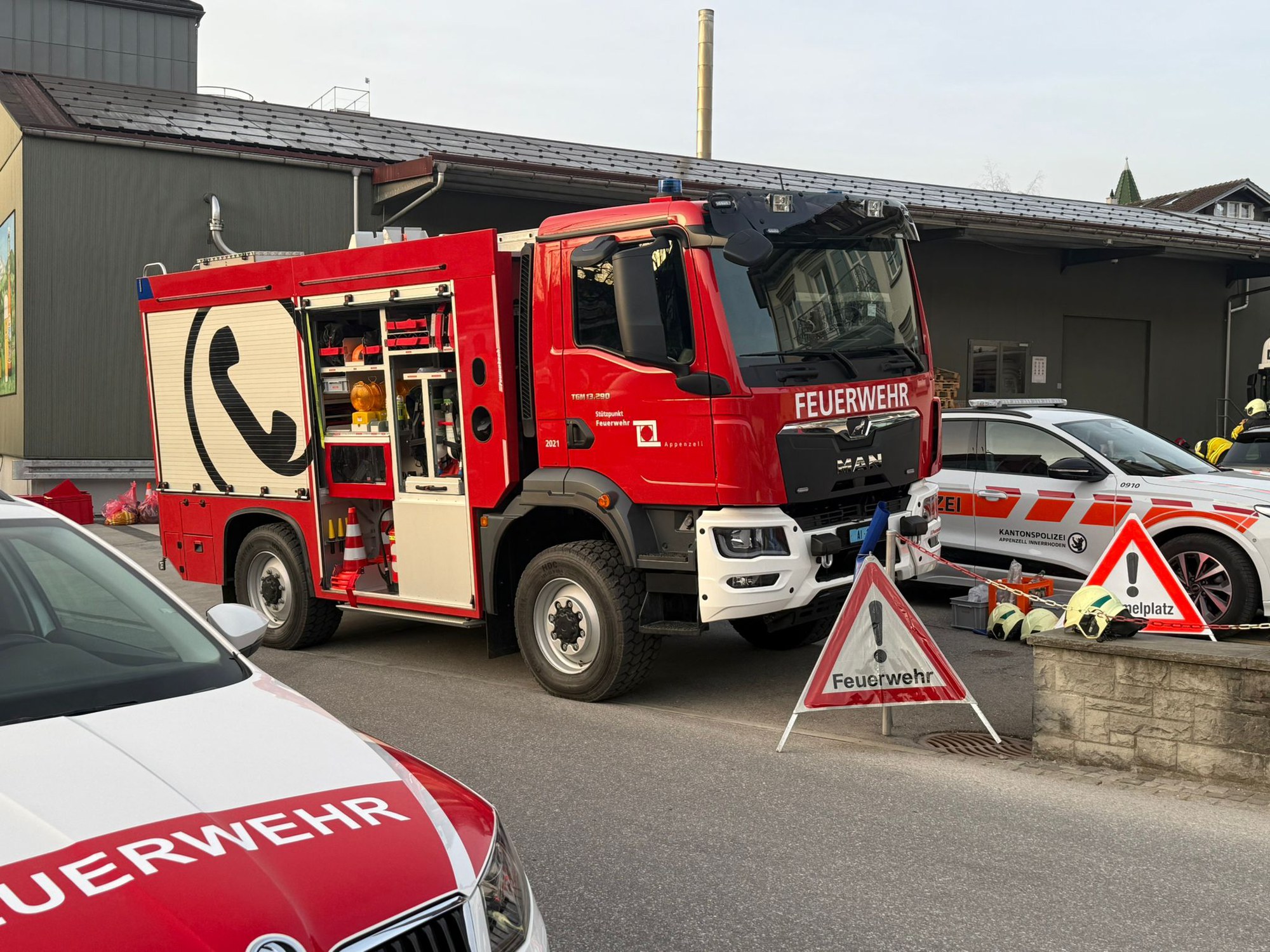 Am Freitagnachmittag (06.03.2026) um zirka 15.20 Uhr wurde in einem Brauereibetrieb Natronlauge umgepumpt. In diesem Bereich fiel eine Betriebsmitarbeiterin aus noch nicht geklärten Gründen in ein Auffangbecken. Dort kam sie in Berührung mit Natronlauge und konnte sich nicht mehr selbstständig befreien. Sofort wurden diverse Rettungskräfte alarmiert. Für die Bergung musste die Stützpunktfeuerwehr Appenzell eine Wand durchbrechen, wonach die Frau aus ihrer misslichen Lage befreit werden konnte. Die Betriebsmitarbeiterin zog sich schwere Beinverletzungen und diverse Verätzungen zu.