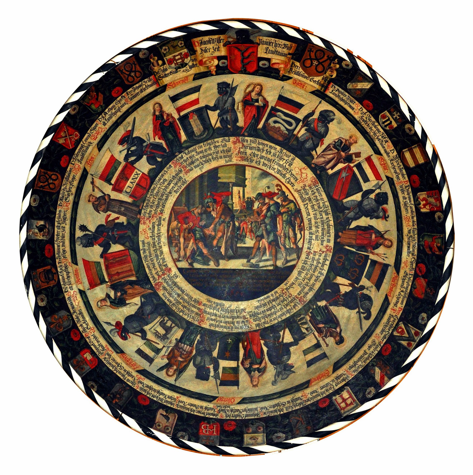 Ratsrose im Rathaus Appenzell: Die Darstellung nimmt eine antike Geschichte des Perserkönigs Kambyses auf und mahnt die Richter, gerecht zu urteilen. 1651 gemalt von Hans Bildstein.